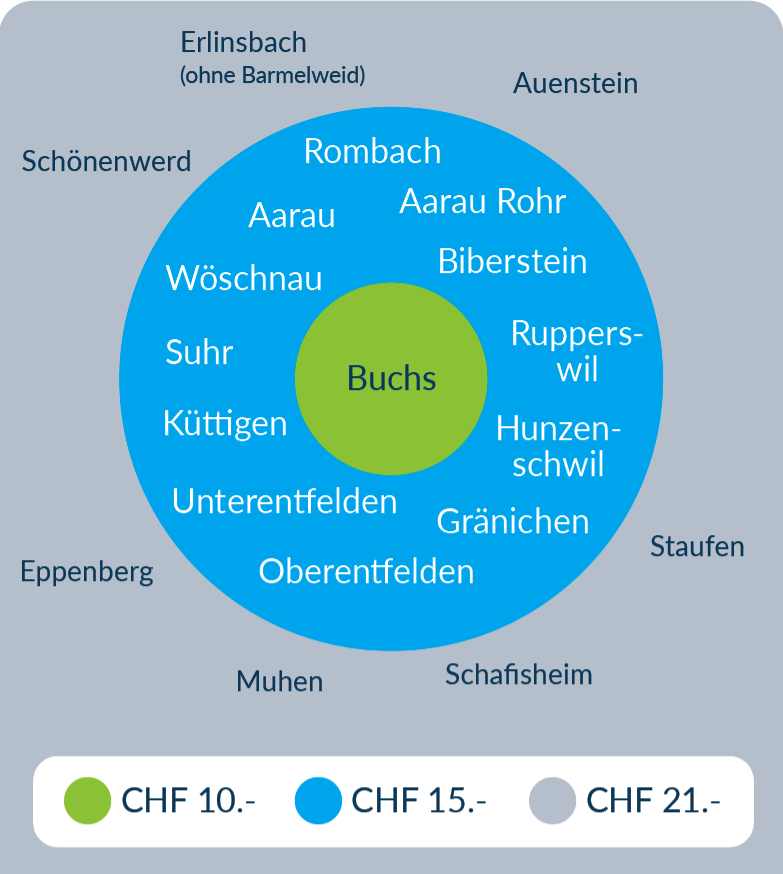 • In allen Zonen sind 60 Minuten Begleitung oder Wartezeit inbegriffen, weitere 30 Minuten kosten je Fr. 5.-